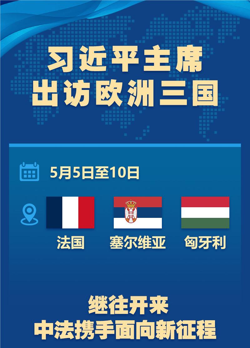 ??應法蘭西共和國總統(tǒng)馬克龍、塞爾維亞共和國總統(tǒng)武契奇、匈牙利總統(tǒng)舒尤克和總理歐爾班邀請,國家主席習近平將于5月5日至10日對上述三國進行國事訪問。